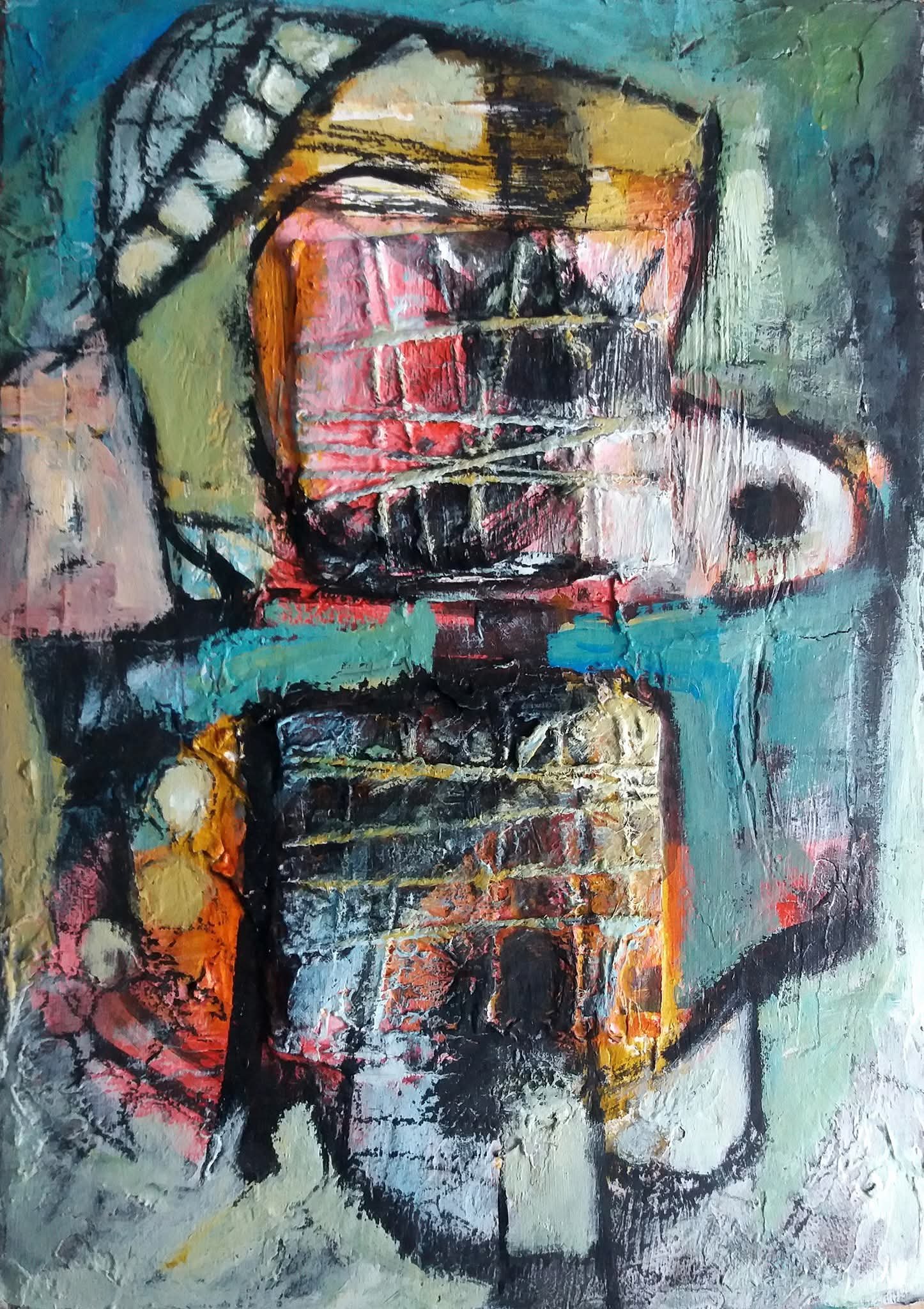 Acrylic spray paint with stencils and oil paint monoprinting overlay.